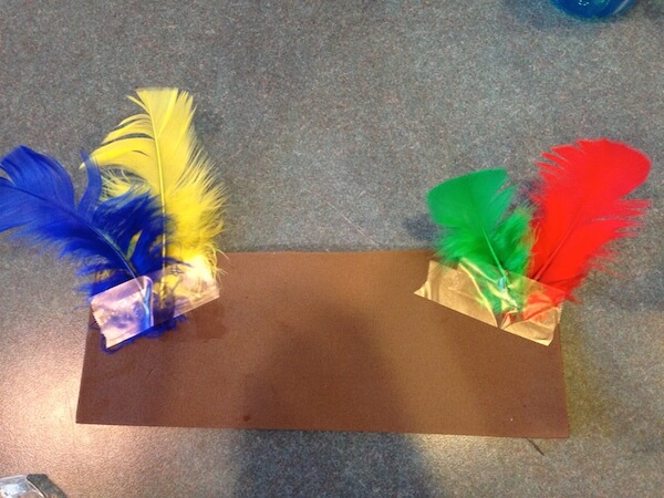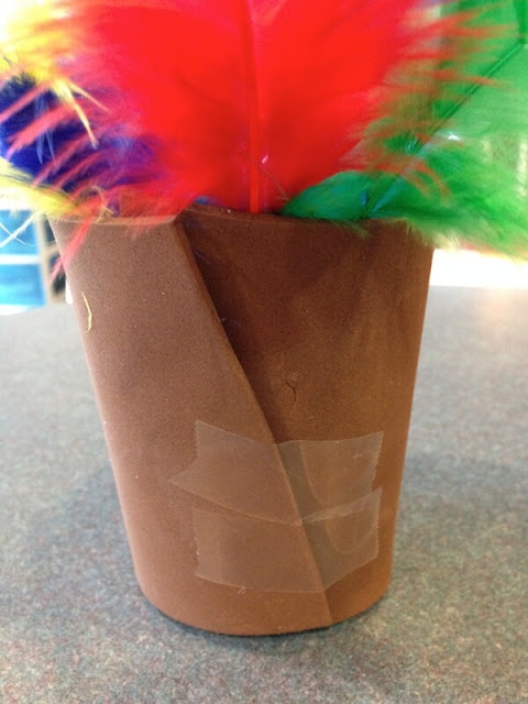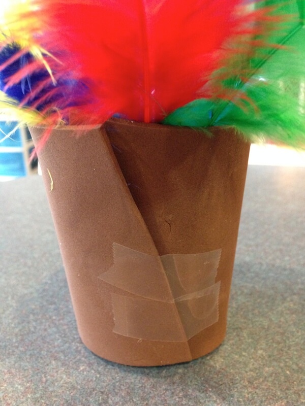 Once it is dry, flip it over and adhere your craft feathers to the back. I used 4 feathers, and taped 2 to each top corner, about 1/2 inch from the edge. You will want some room on each edge for when you wrap the foam around your cup. If your feathers are curved, tape them so that the curve is facing you so that it curves away from the cup when wrapped.