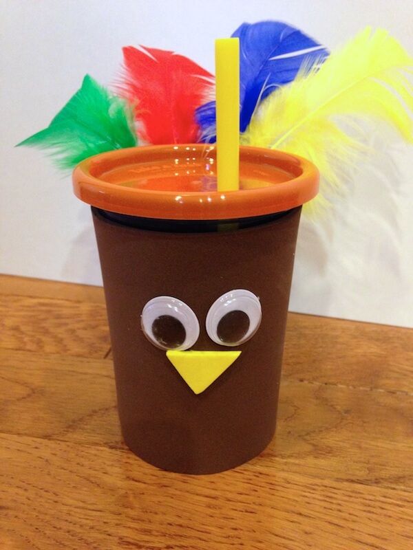 Remove the tape when the glue is dry, add your top and straw, and you're ready to go! A cute turkey cup to dress up your drink at Thanksgiving.