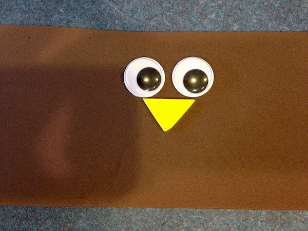 Next, cut out a small triangle of yellow craft foam for the nose. Glue this and 2 googly eyes to the center of your brown craft foam using Mod Podge. Allow to dry.