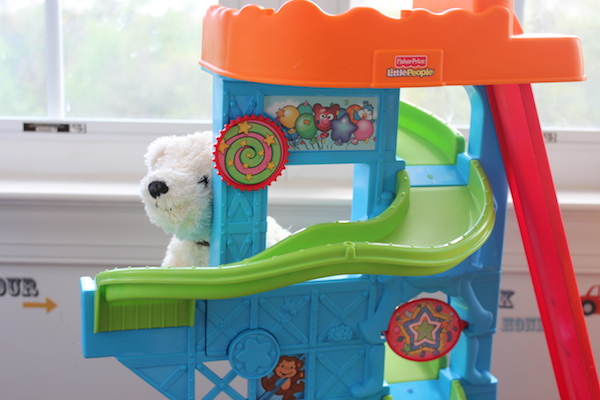 Our Spot finds all sorts of fun places to hide! As we play, I like to mimic the book and ask questions about where Spot might be. This provides a great opportunity for toddlers to work on identifying objects as well as directions like under, behind, inside, etc.