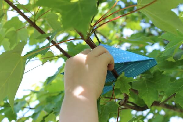 In the story, Rabbit gets into trouble when his toy plane gets stuck in a tree, and he enlists the help of several animals to try to get it out. We decided to make a couple of planes of our own and see if we could make them fly into the tree in our yard.