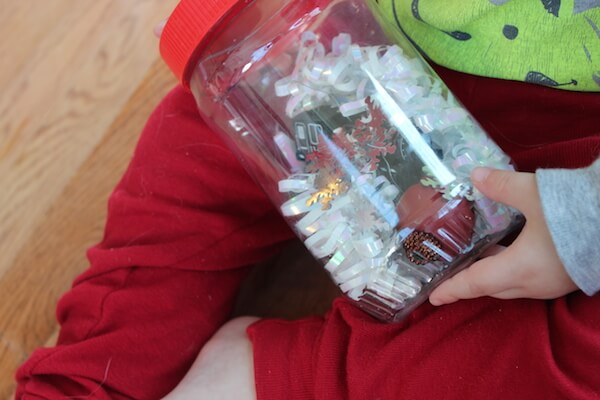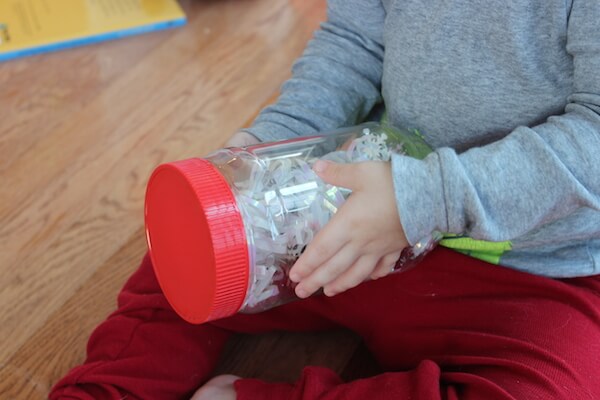 My boys loved rolling the jar around and making the bell ring. We also incorporated some counting practice as I asked them to count the snowflakes inside.