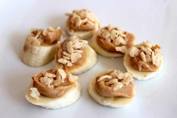 To make your Crunchy Monkey Snack, slice your banana into small circles. Spread a little peanut butter on each slice. Sprinkle with rice cereal. That's it! Quick, delicious, and healthy.