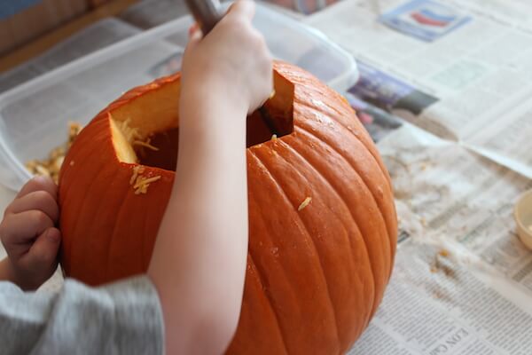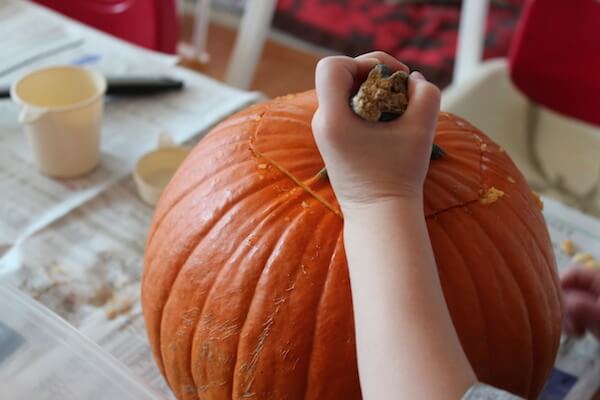 Start by carving out the top of your pumpkin. Then set everything out and invite your children to explore.