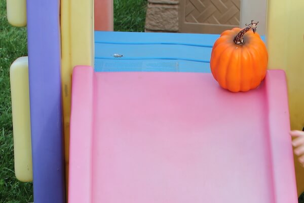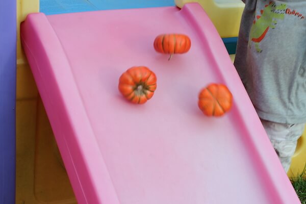They were so excited to see the smaller pumpkins rolling down the slide. Next they tried the smallest of all - and boy did they fly!