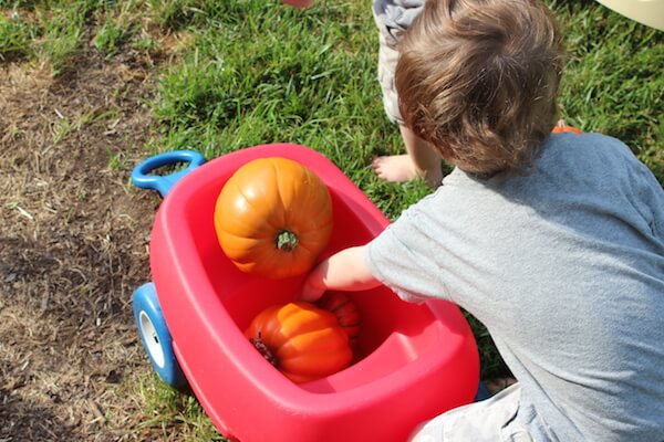 We set up our pretend pumpkin patch in the backyard - you can see the full set up on our post on Pre-K pages here. I love finding new outdoor activities for my kids and they loved this one. We used craft pumpkins because they were much easier for my little guys to carry around. After we were done, the boys loaded up their wagons with the pumpkins and headed across the yard.