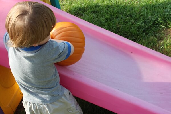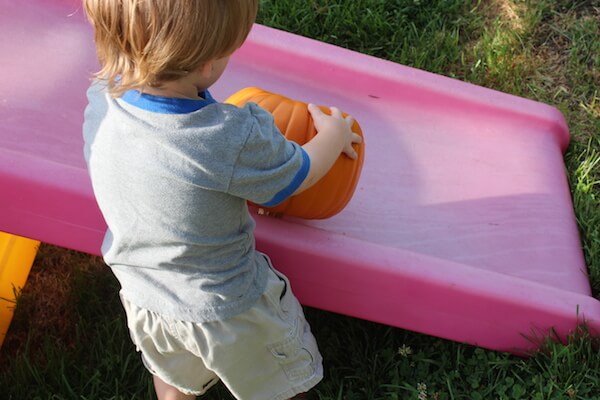 They began with the bigger pumpkins. They were able to get them to the top of the slide with some effort. It was a great exercise in lifting and figuring out how to best get the pumpkin to the top. Then they helped roll it down.