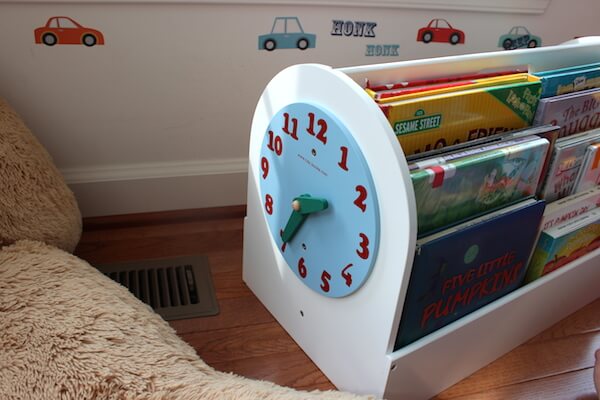 One of my favorite features of the Book Storage Box is this adorable clock. It's made from solid wood and sturdy enough to hold up to little hands. This is perfect for my boys who are learning their numbers and to tell time - they love moving the hands and saying all the numbers. And, the clock is removable, so you can take it off if you need to.