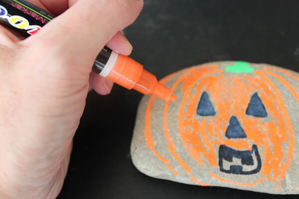 I started with a pumpkin, using the orange and green chalk markers. Since I didn't have a black chalk marker I used a Sharpie for the eyes, nose and mouth. I love how the chalk markers gave a brilliant color while still letting the texture of the rock show through.