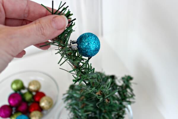 Then drop each branch carefully into the bottle, with the ornament at the top. This will help them lay properly so that it looks more like a tree with the ornaments on the outside. Keep going until your bottle is full - we used 10 total for a large VOSS bottle.