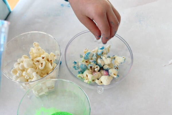 We actually tried this with glue first, but it made a terrible mess! One of my twins dipped the plain popcorn directly in the glitter, and we found that it stuck really well, so we tossed the glue and just dipped straight into the glitter.