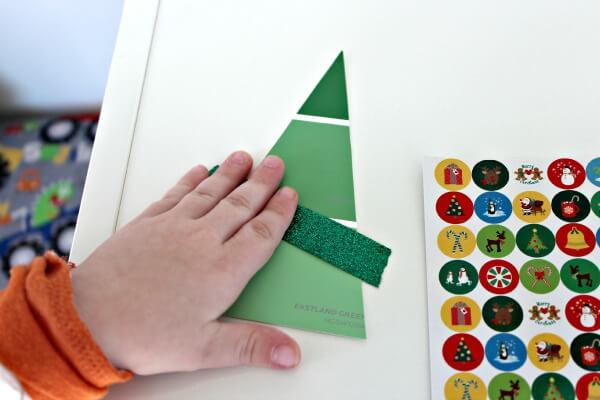 Start by cutting your green paint chip cards into triangle shapes. Set out your washi tape and stickers and invite your children to decorate their trees!