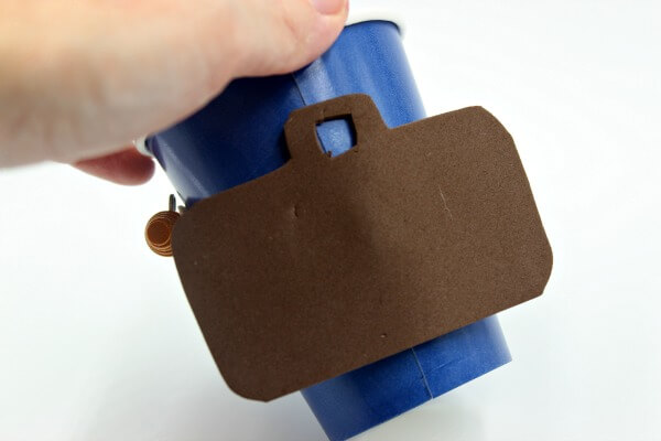 Next, cut a suitcase shape out of brown craft foam. Stick it to the side of your cup using the double sided tape.