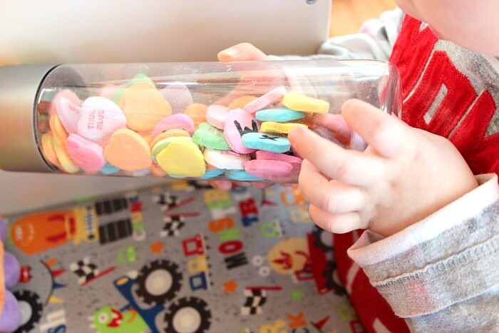 I've always loved candy conversation hearts. As soon I saw them in the store, I grabbed a bag (and ate them all). Then I picked up another bag and vowed to slow down the eating and instead use them for a super fun learning activity for my boys. Since we love discovery bottles, I thought we'd use the hearts to make a really easy Valentine themed bottle. They loved it and as a bonus, the candy is still perfectly edible when you're done!