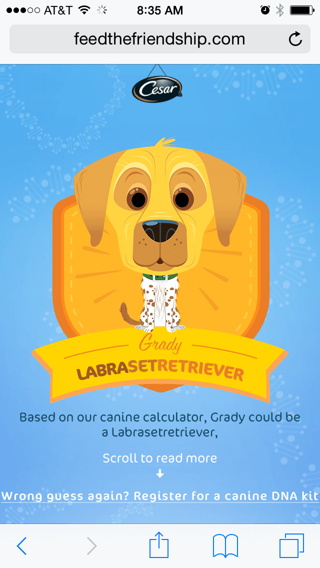 As much as I love that answer, I thought it would be fun to see what some experts had to say about Grady. So I snapped a picture on my phone and uploaded it to Cesar Canine's Feed the Friendship site. Feed the Friendship is a mobile site developed to give people a fun way to engage with and learn more about their dog. All you need to do is take a picture of your pup, upload it to the site, and the site will do it’s best to guess the breed of the dog. It will even provide a fun back-story about your dog’s potential breed! So what would it say about Grady?