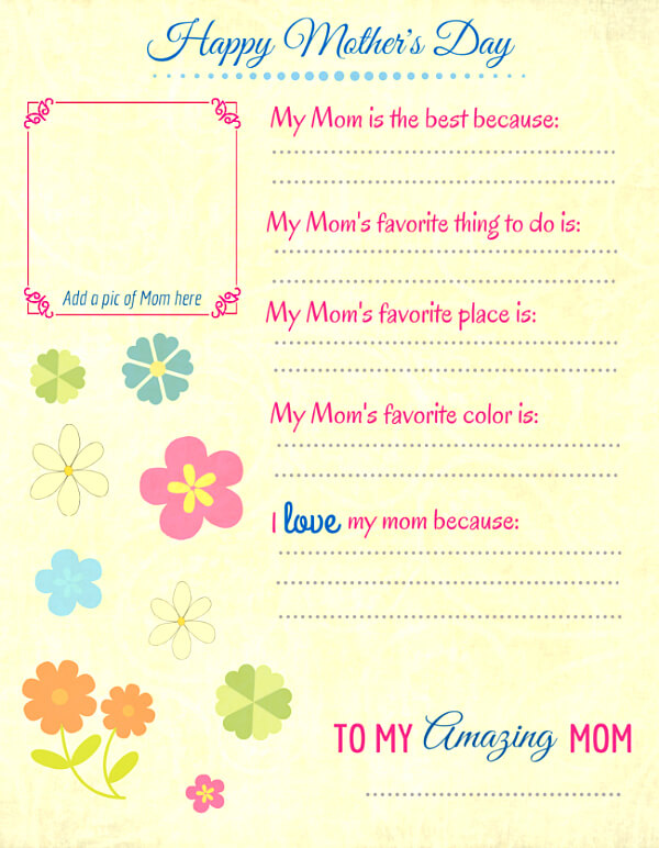 This free printable is perfect for little kids to dictate their answers, or for older kids to fill out themselves. There's also a spot for a picture of mom, which I of course hope is drawn by hand. I just can't wait to see what cute Mothers Day ideas they come up with!