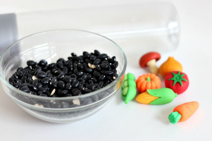 Filling the bottle is an excellent fine motor activity for small kids, and gives you an opportunity to talk about how vegetables grow and what they need. My boys loved dropping the beans in - they called them the "magic beans!"